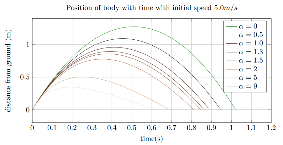 \begin{align*} \lim_{\alpha \rightarrow 0} z(t) &= \lim_{\alpha \rightarrow 0} v_0t β \frac{1}{2}gt^2 + f(\alpha) \\\\ z(t) &= v_0t β \frac{1}{2}gt^2 \end{align*}For the case where the air air drag is zero, we get our familiar kinematic euqation as expected.