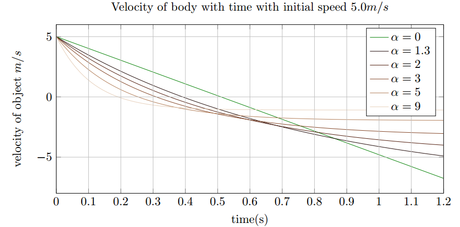 \begin{align} \label{eq:vt} v(t) = -v_t + (v_0 + v_t) e^{-\alpha t} \end{align}Eq. (\ref{eq:vt}) gives us the speed of the body as a function of time. If there was no air drag; i.e., $\alpha = 0$ it correctly reduces down two $v(t) = v_0 β gt$. It can be solved to get the position of the body as a function of time. We have.