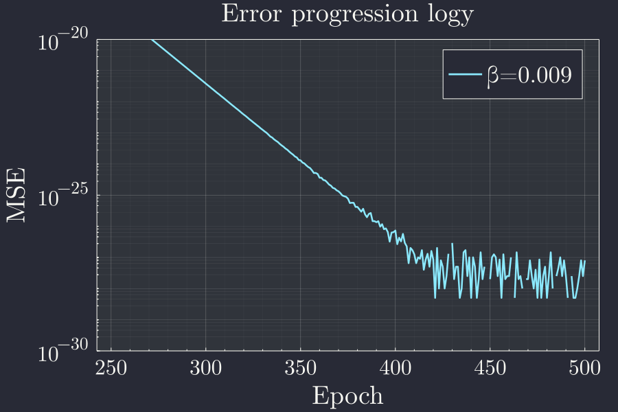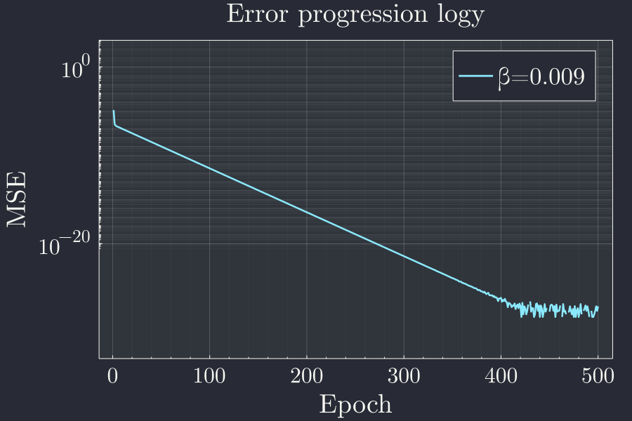 p = plot(xlabel="Epoch",ylabel="MSE",title="Error progression logy",yscale=:log10)