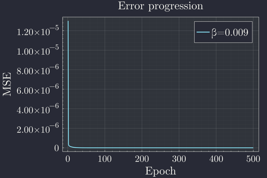 p = plot(xlabel="Epoch",ylabel="MSE",title="Error progression")