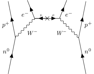 A feynman diagram for neutrinoless double beta decay $0\nu\beta\beta$. Time obviously points upwards rather than sideways from left to right. As my professor said, “I don’t understand why people use left to right to indicate time. Afterall Feynman himself used bottom to top.”