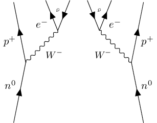 A feynman diagram for two neutrino double beta decay $2\nu\beta\beta$. Time obviously points upwards rather than sideways from left to right. As my professor said, “I don’t understand why people use left to right to indicate time. Afterall Feynman himself used bottom to top.”