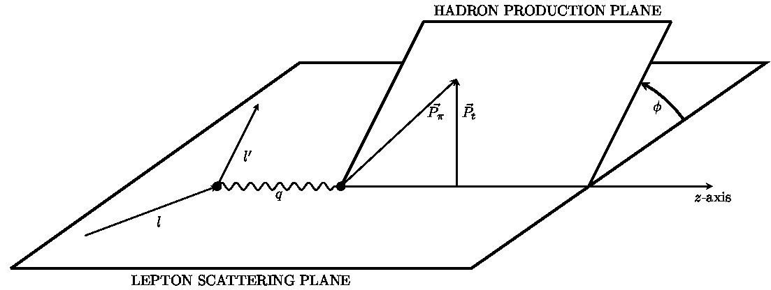 \draw (10.5,3) -- +(2.8,0) node (P){} -- +(-4.35,-5) -- (LPC) node[below,align=center,midway] {LEPTON SCATTERING PLANE};